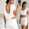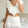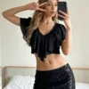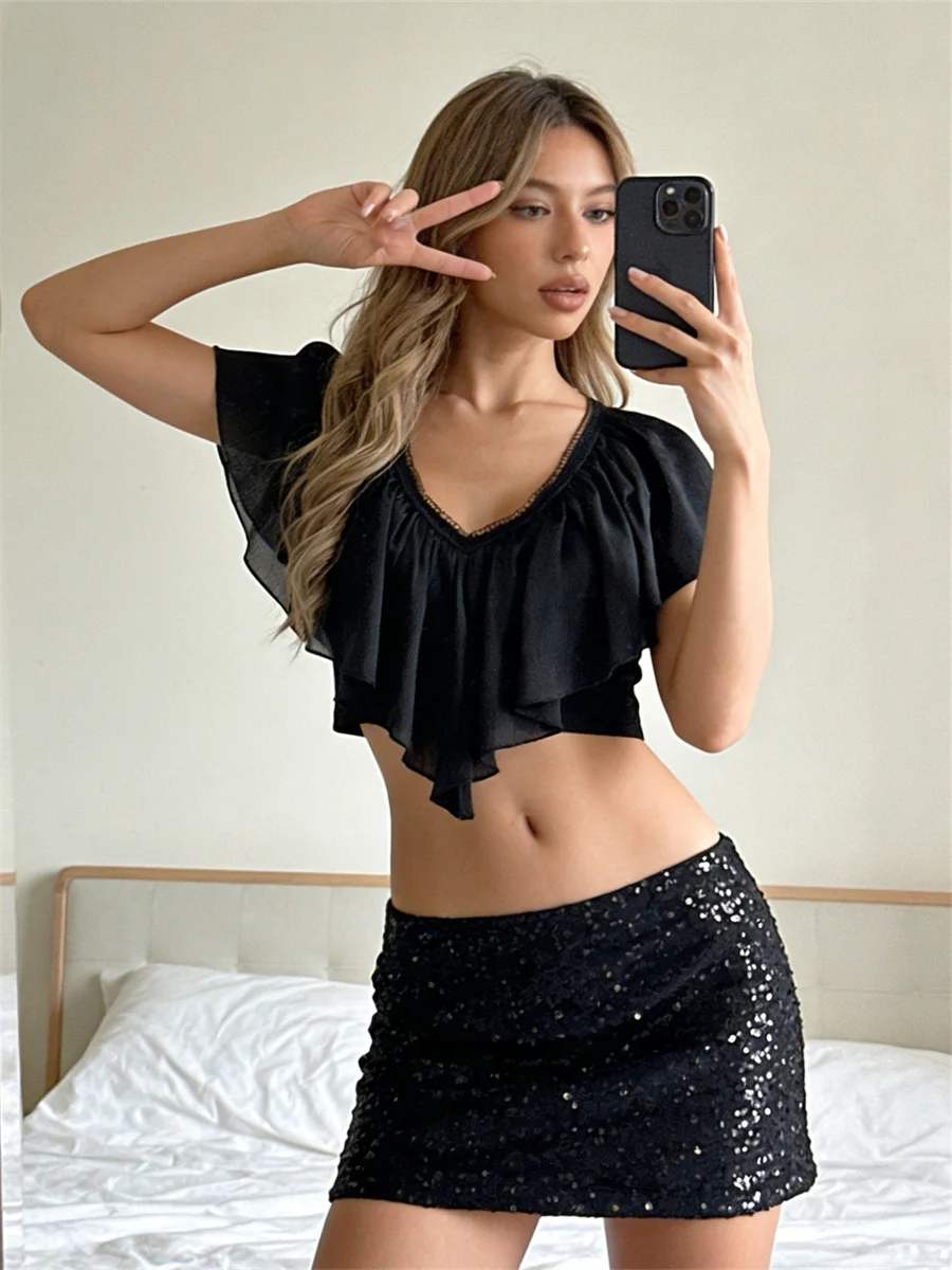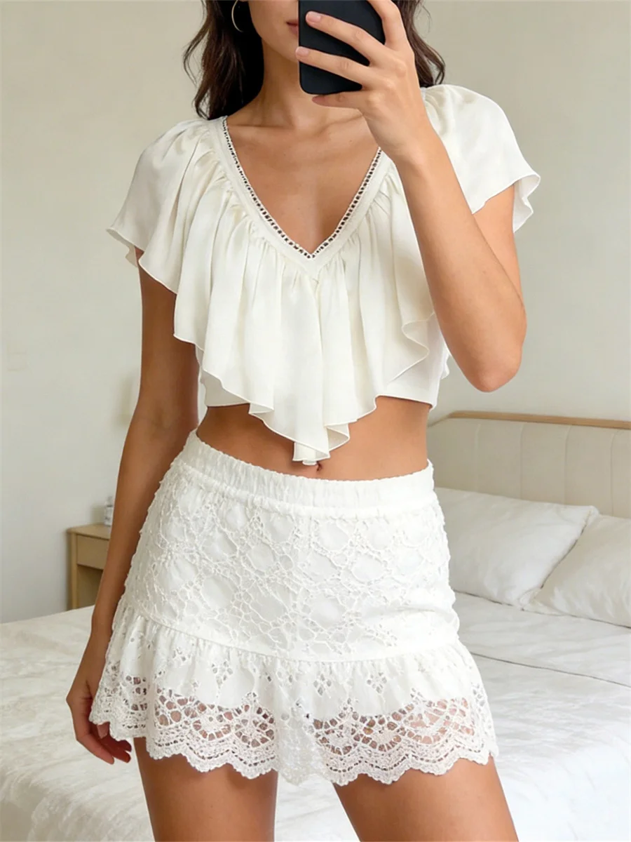 Women’s Ruffled Crop Tops Fashionable Solid Color Lace Trim Tie Back V Neck Blouse for Casual Daily Wear