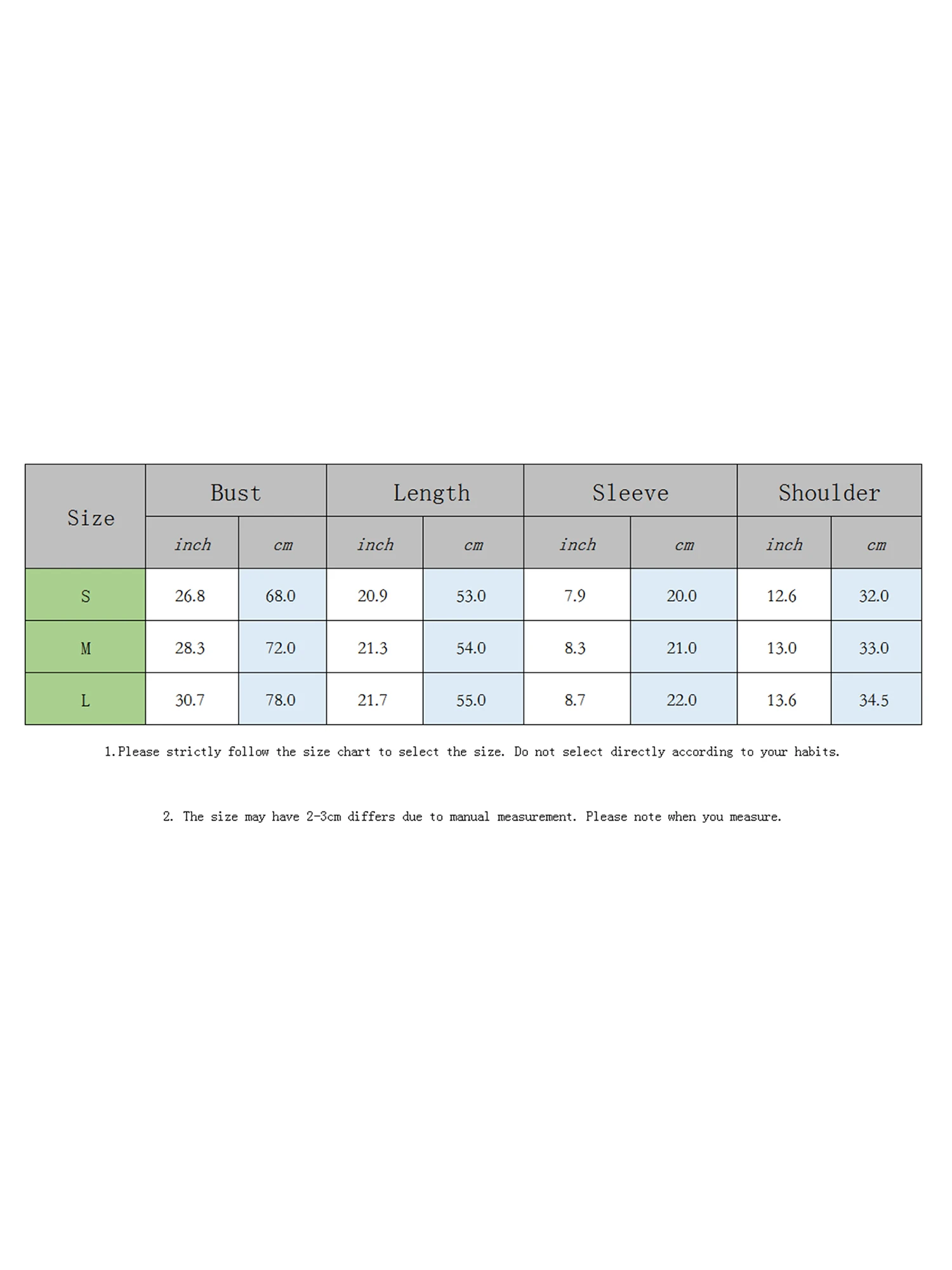S Length: 20.87 Shoulder: 12.6 Bust: 26.77 Sleeve: 7.87