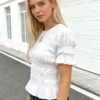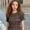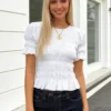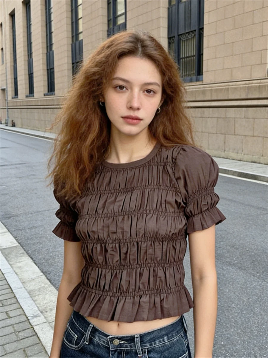 Women Shirred Summer Blouse Slim Fit Solid Color Ruffle Short Sleeve Round Neck Tops for Daily Office