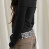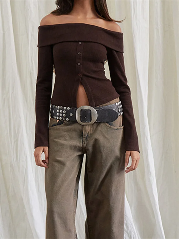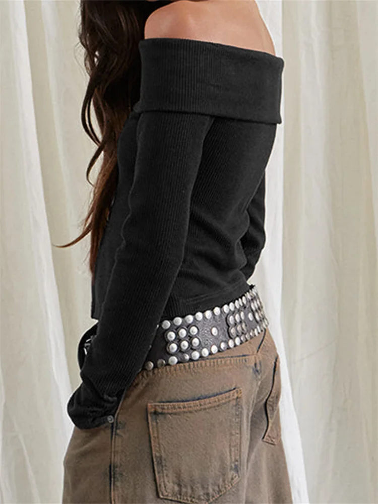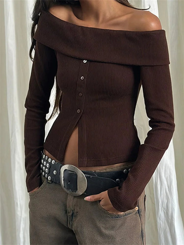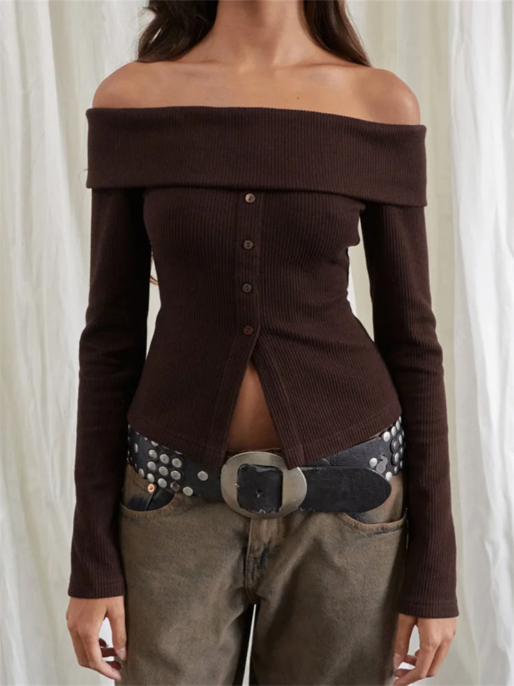 Women T-shirt Long Sleeve Off-shoulder Tops Button Closure Solid Slim Fit Ladies Clubwear